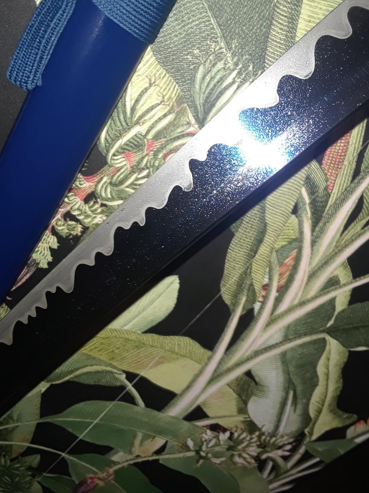 Craftsmanship— it is beautiful. The blue is a very nice color, it doesn’t pop out as expected in the advertised picture but still looks really really good. The skulls around the guard looks cool. So intruders will fear my nine strike deadly skull crusher combo.