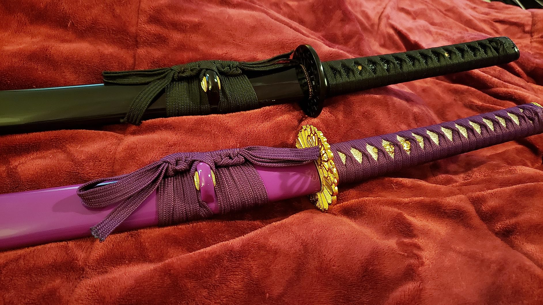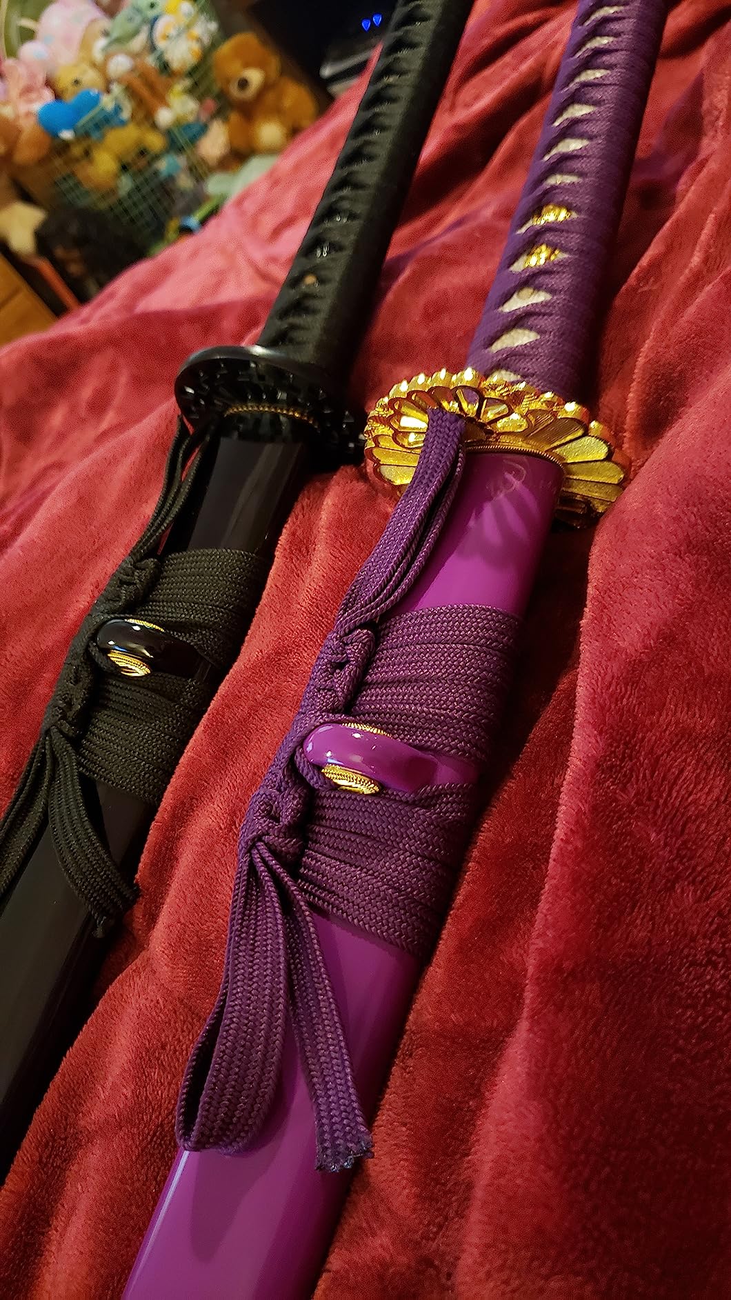 Handcrafted Japanese Samurai Sword – Made with 1060 Steel – Black Scabbard with Purple Sageo